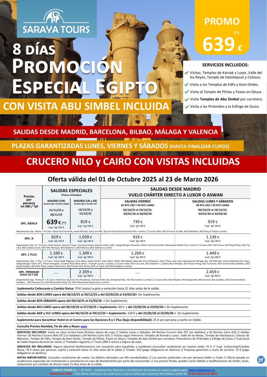 Promo Egipto con Abu Simbel 8días. *Salidas Mad, Bcn, Bio, Agp & Vlc* Crucero y Cairo desde 599 € hasta Sept26